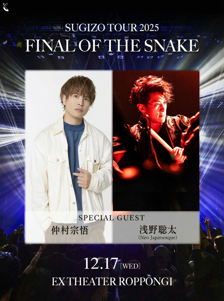 SUGIZO TOUR 2025「FINAL OF THE SNAKE」EX THEATER ROPPONGI公演に最後のピースとしてNeo Japanesqueの和太鼓奏者の浅野聡太氏ゲスト出演決定