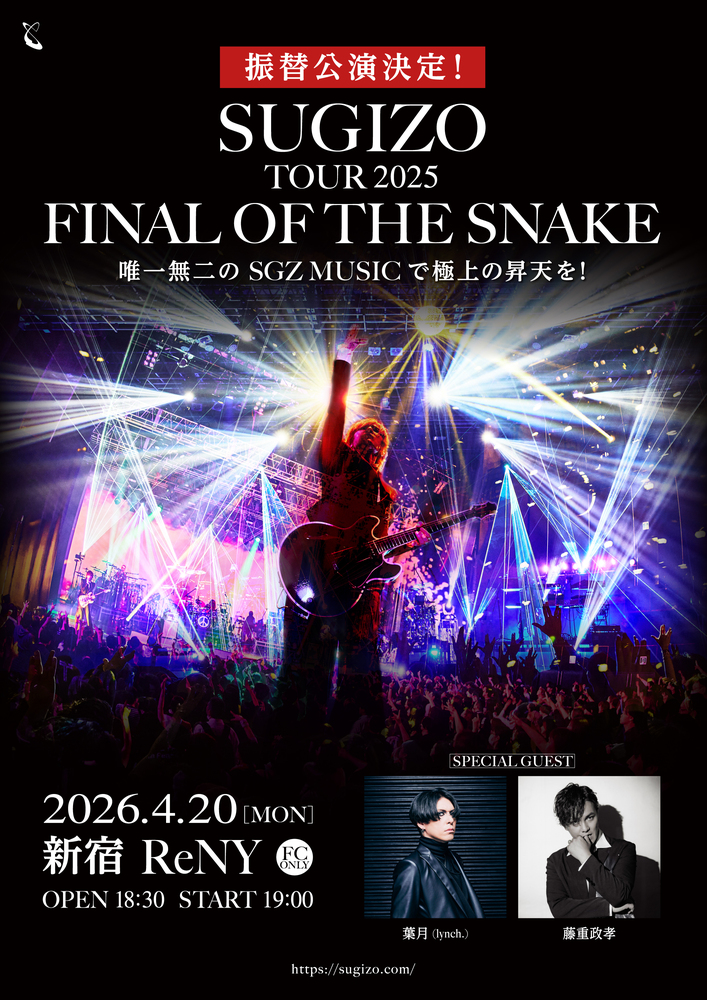 年末に発生致しましたSUGIZOの交通事故により、2025年12月26日に開催を予定しておりましたSUGIZO TOUR 2025「FINAL OF THE SNAKE」新宿ReNY (FC ONLY)公演の延期につきまして、開催を心待ちにしてくださっていた皆様には、誠に多大なご心配とご迷惑をおかけしましたことを、改めて深くお詫び申し上げます。